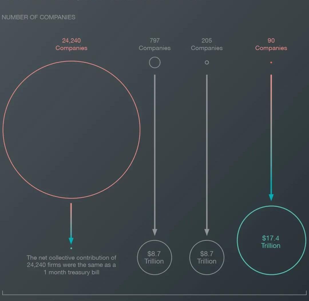 然而,其中2.4萬家上市公司的合計財富創造幾乎為零,最卓越的90家公司(占比千分之三)創造了接近一半的財富。