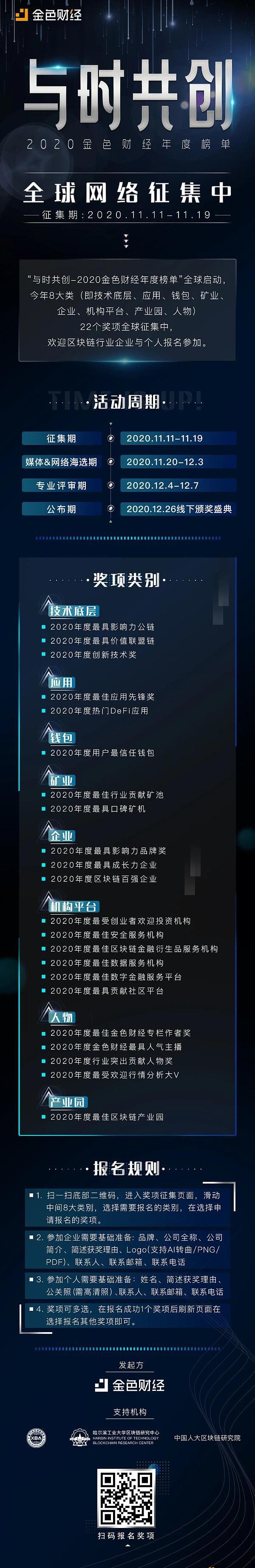 今年“與時共創”金色財經年度榜單設8大類22個獎項包括最具影響力公鏈、最具價值聯盟鏈、年度熱門DeFi應用、年度創新技術獎、用戶最信任錢包、最佳行業貢獻礦池、最具口碑礦機、最佳金色財經專欄作者獎、金色財經最具人氣主播、行業突出貢獻人物獎、最受歡迎行情分析大V、最具影響力品牌獎、最具成長力企業、年度區塊鏈百強企業、最受創業者歡迎投資機構、最佳安全服務機構、最具貢獻社區平臺、最佳區塊鏈金融衍生品服務機構、最佳數據服務機構、年度最佳數字金融服務平臺、最佳應用先鋒獎、最佳區塊鏈產業園全球征集。