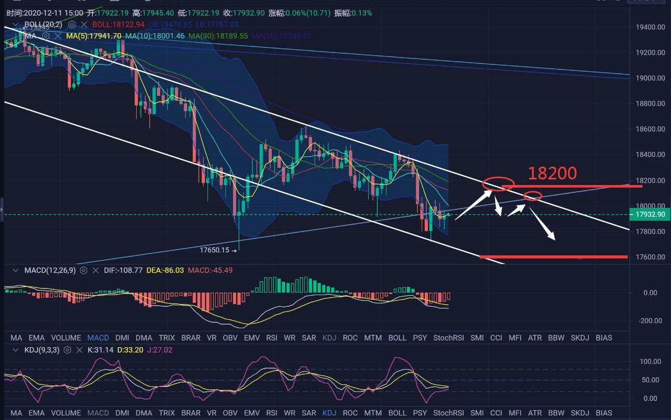 現在BTC正在17800的MA30一處掙扎,一旦破位,下方強支撐只有16800一線,中間的空間太大,做多止損和盈虧比難以控制,圣誕劫即將到來,12月的主旋律都是以活著為主,保證之前的利潤才能活過牛熊,近期推薦以空為主,以多為輔,等待16500附近的一根放量針再做右側趨勢多!
