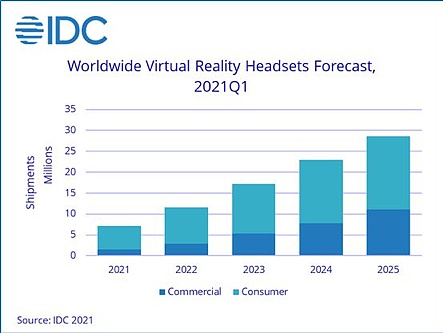 元宇宙的發展會帶動一系列產業的高速發展,例如芯片、顯示、傳輸、通信等產業。根據IDC的數據預測,在2021-2025年間,全球VR虛擬現實產品出貨量有望達到約41.4%的年均增速,AR增強現實產品出貨量有望達到約138%的年均增速。預計2021-2025年全球VR頭顯出貨量將保持41%的年復合增速。預計2021年的出貨量將由2020年的670萬臺提升到850萬臺,2025年更是將達到2860萬臺。