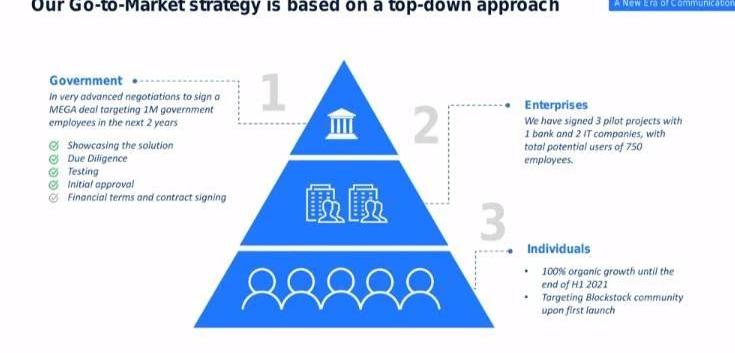 從這里開始,我們將采用一套自上而下的市場戰略進一步擴大規模。目前,我們正在同政府就簽署一份大型協議進行最后的洽談,這份協議將在兩年內為我們帶來100萬用戶。之后,要想吸引更多企業和個人加入就很會容易很多。