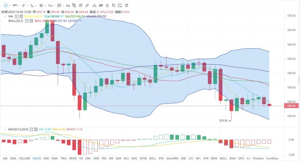 以太坊昨天一直處于335-342區間盤整中,價格走勢偏弱,早間依然處于上方受制回調下行趨勢,預計日內價格在打破此前的震蕩區間后,會測試昨日低點333位置,若此位置被打破,下方空間將被打開,有望回測下方布林下軌支撐。