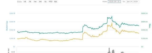上圖是Maker幣價從4月份以來的走勢,我們發現其幣價長期徘徊在300美元,只是在近期稍微漲到了500美元,這個走勢與COMP和路印的走勢完全不匹配。因此Maker似乎與這輪個別明星項目的大漲毫無關系。