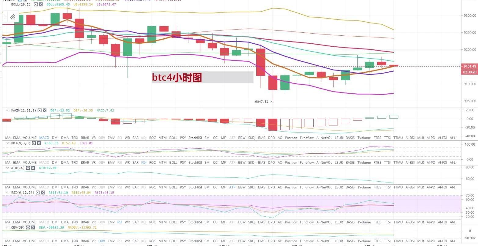 持幣者還是可以延續持幣者昨天的思路,昨天雖然幣價在晚間拉升到9150一線,但是這是明顯的誘多,還需要警惕空軍的突襲。昨天比特幣開盤價在9124美元一線。昨天比特幣幣價在9100-9150附近波動,波動幅度不大,可以說是白天橫盤了,在晚間19點幣價開始急速拉升,布林帶開口,出現日間最高點9183美元一線,隨后回落在MA5均線之下,收盤價在9147美元一線。
