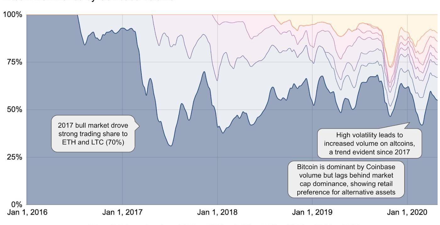 在牛市期間,投資者似乎更愿意考慮持有山寨幣,例如在2017年ICO熱潮和以太坊牛市期間,比特幣在Coinbase上的市場主導地位降至30%以下。在短暫的時間內,以太坊是Coinbase上的主要交易資產,交易量約占總交易量的50%。