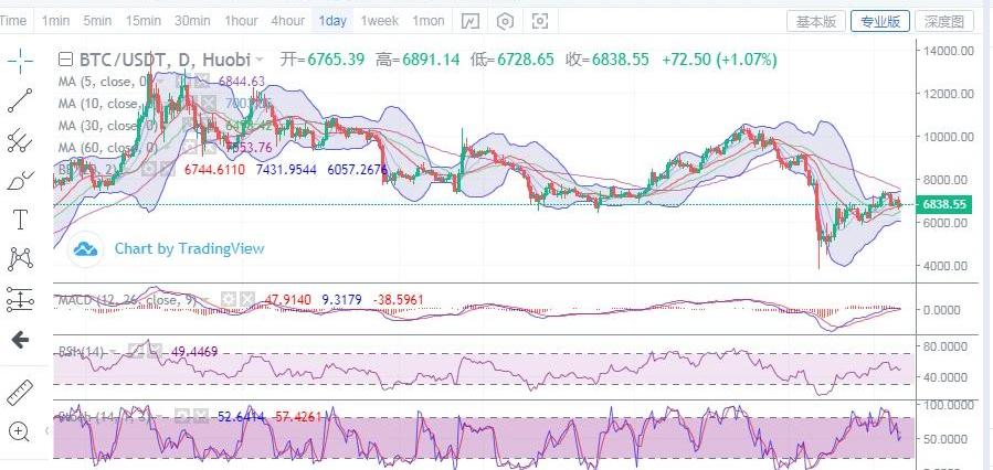 行情回顧:比特幣價格昨日晚間多次試探6800-6830位置,但是均未能上行突破。直接日內凌晨3點,價格再次上行終于站上這一線位置,并多次向上試探6900位置。截止到目前早7點20分,比特幣價格運行于6856附近。