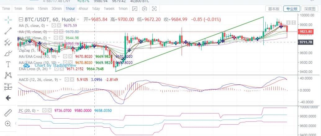BTC昨日開盤在觸摸9800位置附近后回落至9700附近震蕩運行,近幾日的橫盤多頭蓄力已久,直至凌晨1時之后多頭開始發力,在沖高觸及9980位置而后回落,最低觸及9600位置附近開始反彈。