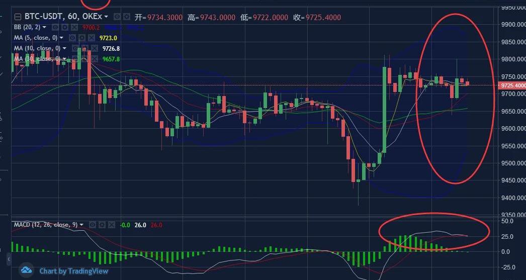 BTC今日開盤在9480一線,小幅盤整之后于早間3時行情直接拉升300點到達日間高點9811一線附近,然后稍有回落,白盤整體維持在9740一線附近震蕩;下午4點開始一波深度下探,瞬間下落100點抵達9637一線,然后又開始拉升近200點抵達9800一線,目前行情回落至9740一線震蕩;如此過山車行情對于整個幣圈市場來說是一波福利,同時也是一波災難,易天認為在這樣的行情下,操作一定要控制好風險,利用某種特定的倉位管理去進行風控,那么吃波行情紅利還是沒有問題的!