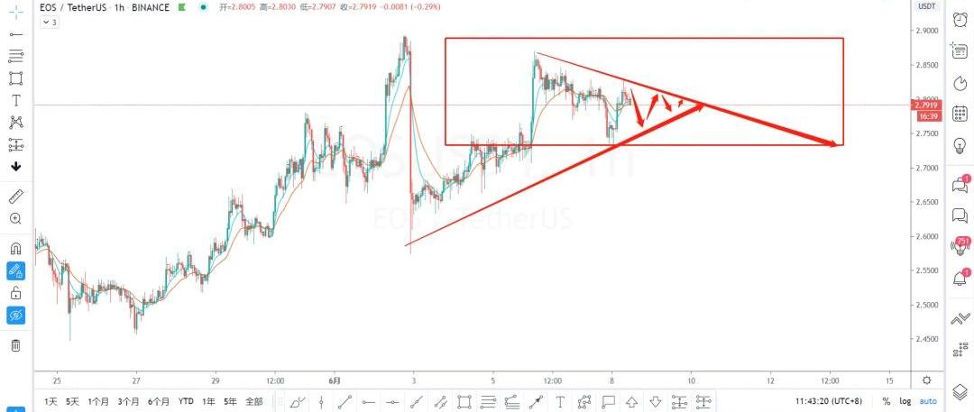 06.08:走收斂行情,價格反復觸碰上下沿,留意上下沿的多空機會,弱勢回踩2.757附近做多,2.825附近空