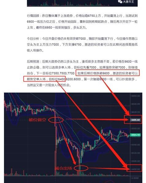 行情從15日來一直處于連續下跌,并沒有給予多頭很大的希望,大唐幣王在昨天的文章中寫到,要是行情可以跌破6600則順勢空單進場,在昨日行情到6480位置又出現上漲回調信號,我們則在內部群發布及時獲利出場,獲利一百點。