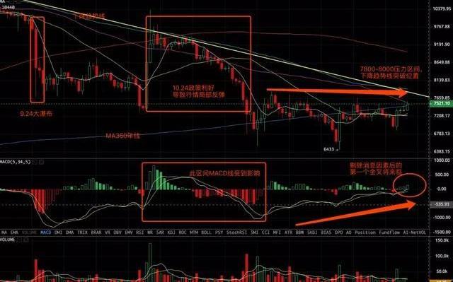 一般來說,MACD零軸附近的金叉,才是絕佳的買入時機。目前日線級別,金叉有望在0軸附近形成。從整體趨勢來看,此次金叉有可能是9.24日大瀑布跌破9000美金后,剔除10.24日消息刺激導致的短期反彈因素后,收回的第一個金叉走勢,一旦量能上配合,形成“MACD零軸金叉+日線級別放量+MA360年線長期趨勢支撐+MA60均線中期支撐”,也便意味著行情有較大概率反轉,由空頭主導格局到多頭主導格局。