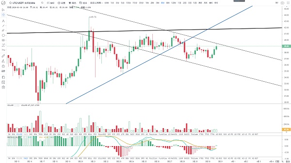LTC自前期跌破觸底反彈得上行趨勢線后,回調量能并未持續放大,所以近期大幅下殺的可能性不大,近期4小時又走出了個潛在雙底結構,MACD指標線金叉,目前量能是關鍵,只有放量突破站穩39.5美金上方,短期雙底結構才會確立,不過上方面臨長期周線趨勢壓力42美金,以及前期上行支撐轉壓力的趨勢線雙重阻力,按目前量能,直接突破的可能性不大,沖高回落的概率大些,支撐35美金。