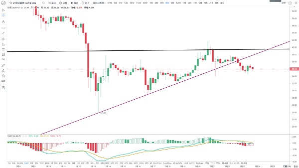 短期4小時,價格三角形態末端跌破,下跌量能沒有持續放大,目前點位已跌至前期平臺震蕩區域,當前量能直接跌破的概率不大,處于5日和10日線區間波動的概率大些,等待20日線下壓出方向。短期支撐34美金,壓力40美金。