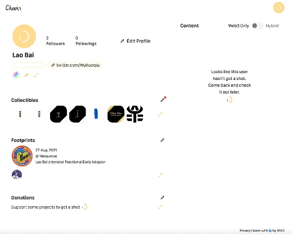 目前有一些項目在使用RSS3的數據索引和分發,比如cheers.bio, Showme.fan等等,有興趣的讀者可以去體驗下這些項目,還是挺有意思的。