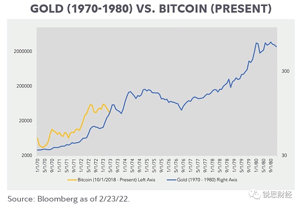 如下圖所示,黃金并沒有以一種一致的、容易預測的或低波動的方式進入這個既定的資產類別。此外,有趣的是,看看比特幣是如何大致遵循類似的模式的。但是,請注意,圖表的簡單疊加或比較不應被用作任何類型的模型或指標。我們在這里只是強調一個新興資產類別的歷史發展,它在經歷自己的價格發現過程時經歷了非常不穩定的時期。? ? ? ???