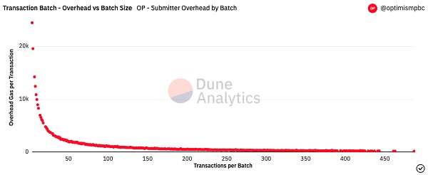 2. 開銷:隨著總 batch 的尺寸變大,在一個 batch 中添加一筆交易的開銷會減少。這是 L2 擴容與 L1 擴容不同的一個地方:交易越多,交易費就越便宜。開銷已經從 2750 gas 減少到 2100 gas,并會隨著 Optimism 的使用率增加繼續減少。