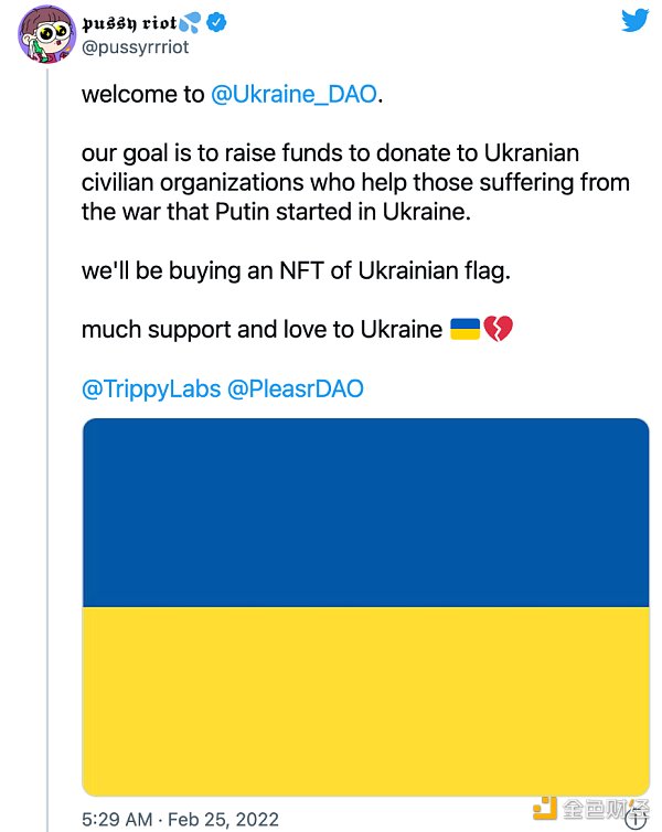 2月25日,戰爭打響的第二天UkraineDAO正式成立,創始人發推表示UkraineDAO的目標是籌集資金,向烏克蘭民間組織捐款,幫助那些遭受戰爭之苦的人。