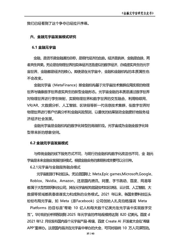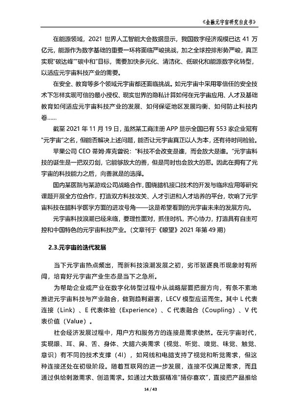 白皮書認為,元宇宙新經濟具有巨大的發展潛力,將引導一個國家或地區的金融發展創新方向。元宇宙的深度發展將可能重塑金融產業的模式和生態,而人依然是其中最重要的研究和服務主體。數字空間與物理空間的深度融合將加快金融行業數字化轉型,形成新的金融產業機遇。