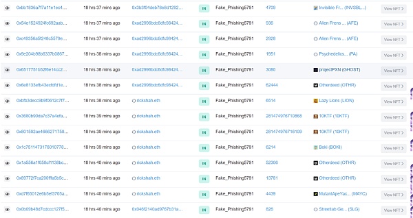 第二步,攻擊者通過釣魚網站獲得32個NFT,其中包含2個BAYC。