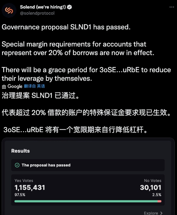 該提案輕松通過,110多萬張 “贊成 “票對3萬張 “反對 “票。然而,其中超過100萬張票來自一個擁有巨大治理代幣持有量的用戶。如果沒有他們的投票,該議案就不會通過法定人數所需的1%的參與率。