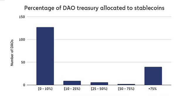 然而,穩定幣很少占到鏈上大部分財物價值。平均而言,85%的DAO的鏈上財物存儲在單一資產中,而在我們研究的DAO中,該資產只有23%是穩定幣。