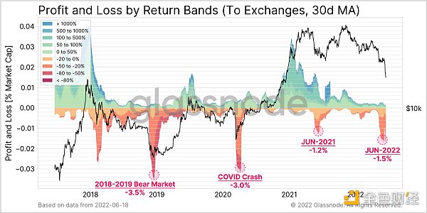 接下來,我們可以通過已實現的利潤和虧損程度來表現交易所流入量的盈利情況。過去一個月交易所流入量主要是已實現虧損,總規模超過市值的 1.5%。