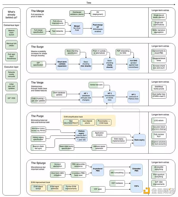 在路線圖上,無狀態 Ethereum 是另一個目標。區塊生產者將使用見證信息 witness,這是由執行區塊中交易所需的相關數據組成的證明。然后,客戶端可以利用這個證明來驗證執行區塊所產生的狀態根,它們只需要執行受影響狀態的一部分,而不是全部狀態。在這一設計中,該證明的規模和可用性是兩大核心問題:第一個問題可以通過將 Ethereum 的狀態數據結構從protocol-level specification)來解決。根據 Vitalik 的說法,在擴展 Ethereum 的過程當中,我們需要在保留去中心化驗證的同時,仰仗于擁有專業硬件的中心化區塊生產者。