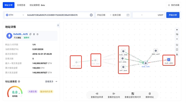 「0x8bf6」的資金來源比較繁多,其中最大單筆轉賬為1萬 ETH,共計19筆。這19筆中的一筆,即1萬ETH的轉賬,經過多層反溯,由「0x977a」發送。