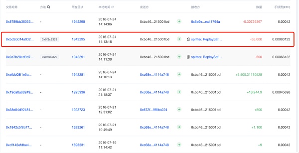 在硬分叉之前,這兩條鏈的代碼是相同的,歷史賬本也是相同的,而分叉前持有ETH的用戶,在分叉后會同時擁有等量的ETH和ETC資產,在分叉前的轉賬記錄會同時存在于ETH和ETC,包括哈希、from地址、to地址、金額、交易費等。