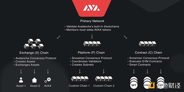 Avalanche的主網絡由三個區塊鏈組成——X、P 和 C 鏈。每條鏈在維護Avalanche的完整性以及創建新資產或區塊鏈方面都有不同的用途。