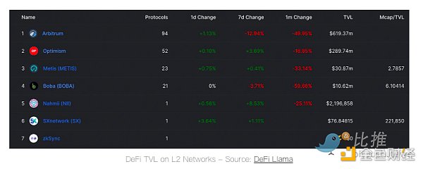 自上線以來,Optimism 在匯總中的 DeFi TVL 份額從 17.26% 增長到 30.42%。