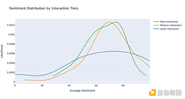 然而,結果顯示該假設不成立。依據 NFT 項目的參與度等級,我們將它們分成了三類(參與度活躍、中等和不活躍),每一類中的項目數量一致。我們依據三種不同的參與度等級,依次繪制了粉絲情緒分布曲線(如下圖),橫軸代表積極情緒值所占百分比,縱軸代表對應百分比值的分布概率。