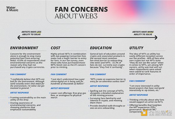 最終,影響粉絲情緒的主要因素還是落回到以下兩點:第一,藝術家與粉絲群體之間的關系是否足夠牢固,這是音樂行業 Web3 項目的核心要點;第二,在主流敘事背景下,粉絲們對 NFT 作品的接受度。另外,我們可能需要留意那些不受我們掌控的外部因素(比如,區塊鏈技術的環境成本),但我們需要優先考量的,依舊是可控范圍內的杠桿(比如,真實的創造力、社區建設、良好的意圖和價值觀),并將這些作為發行 NFT 項目時的主要聚焦點。