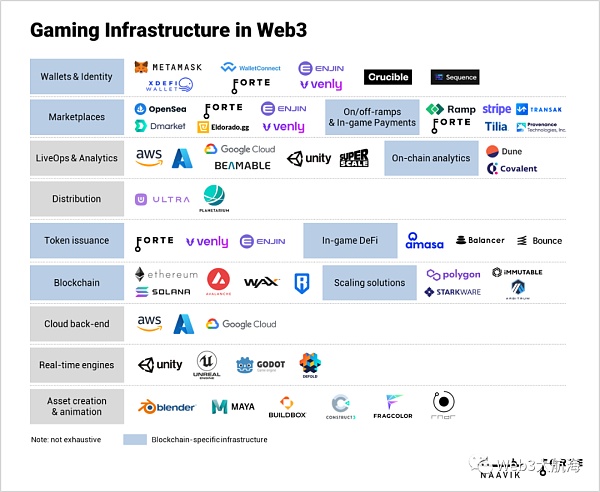 在資產創建和動畫、實時引擎、云后端以及LiveOps和分析等領域,同樣的工具和公司可以而且正在被用于Web3。因為區塊鏈游戲依賴于同樣的構建模塊:創意軟件、可擴展的服務器和數據驅動的優化對它們和任何免費游戲的移動游戲一樣至關重要。例如,地平線區塊鏈游戲利用谷歌云和AWS進行應用托管,并利用Figma和Photoshop進行設計。