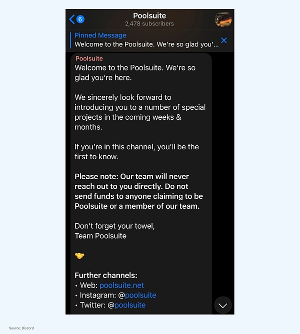 只有一條歡迎信息的 Telegram 聊天群組,采用了極簡布局,讓社區成員的上手難度大大降低。當新成員加入 Poolsuite’s chat 時會看到如下的畫面: