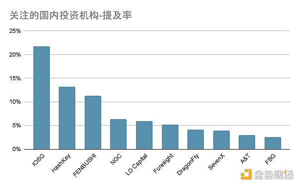 國內投資機構提及次數最多的是 IOSG,提及率 21%,其次是 Hashkey、FENBUSHI,從總的提及率來看與國外投資機構有較大的差距。