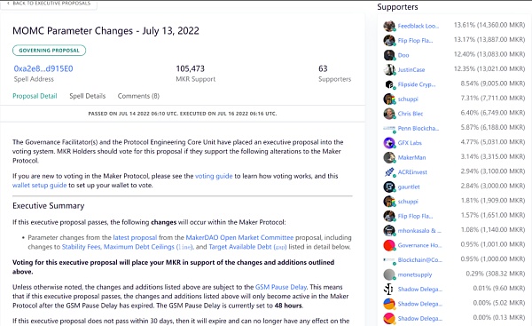 在了解完MakerDAO的治理流程后,我們可以觀察MakerDAO治理的實際情況,截止至2022年7月26日最新的一個MakerDAO治理提案。