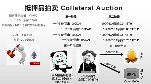 擔保品拍賣(Collateral Auction):在第一階段擔保品拍賣中,競價者開始對拍賣的抵押品出價,最高價者支付 DAI來低價獲取抵押品,回購的 DAI 用來彌補金庫的未償債務及清算罰金。