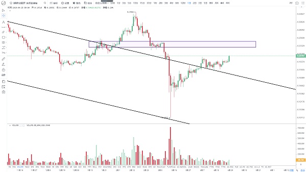 XRP今日走勢比較強勢,目前價格突破前期高點,當前正嘗試上穿3月下跌中繼整體壓制區域,高點主要在0.22美金附近,這一帶上破就要進入0.23-0.25強壓區,前期價格在此區間橫盤整理的時間相對較長,這一帶的套盤阻力較強,所以上方的壓力位還是比較密集的,量能持續跟上,才有望進一步向上突破,否則沖高回落的概率大,操作上要謹慎,支撐0.195美金。