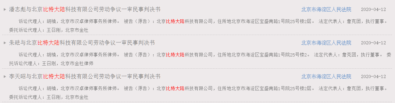 2019年,比特大陸起訴了前雇員幣印礦池聯合創始人潘志彪、朱砝、李天昭三人,要求賠償3000萬元人民幣。2020年1月6日,對此爭議進行了判決。判決書中包含了查明信息和裁判結果。具體判決如下: