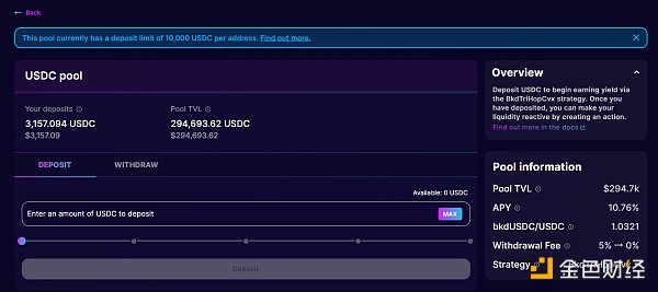進入存款頁面后輸入想要存入的代幣數量并點擊「Deposite」即可。需要注意的是,協議目前仍有 1 萬美元的限制。此外,存入的資金若立即取出則會產生 5% 的手續費,該手續費會隨時間而降低,7 日后會取消。