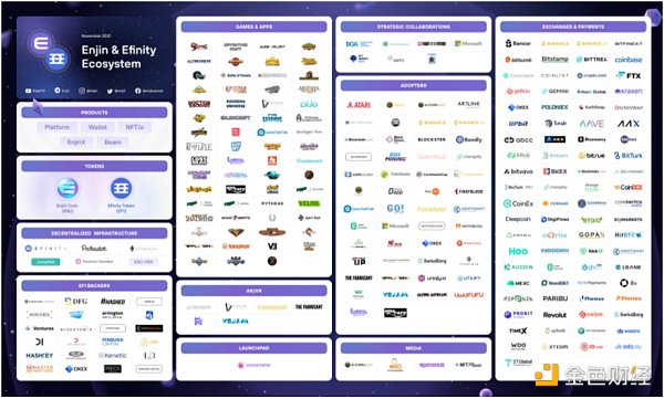 Enjin 作為老牌的 NFT 平臺,有著錢包、開發平臺、Marketplace、擴容方案 JumpNet 等組件,提供通用 SDK、API 和開發工具,以及完備的開發者文檔,并實現了工具層的互操作,已經構建起較為完善的生態系統與合作伙伴關系。