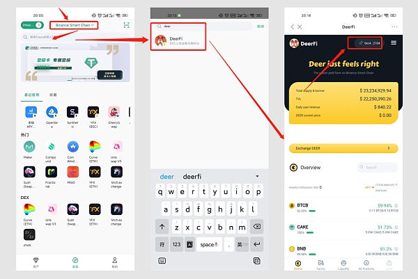 以上圖中BTC的最高收益池 DeerFi為例(圖中LOGO可見該項目運行在BSC鏈),我們來看下如何操作: