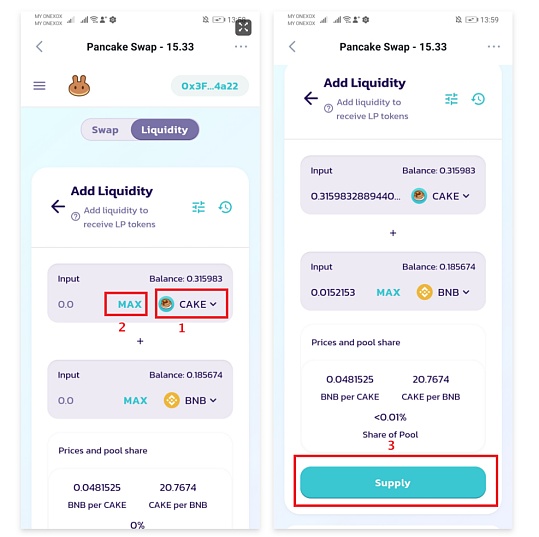 3. 選擇要組的LP(例如:Cake-BNB),點擊MAX后點擊下方SUPPLY;