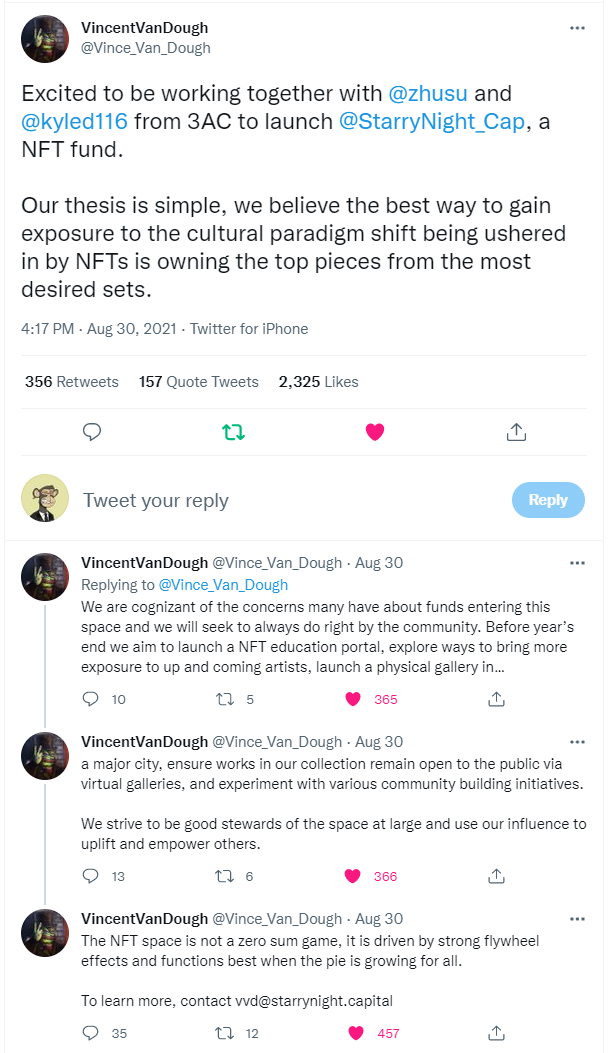 除此之外,他們甚至要專門成立一個基金用來向大眾普及推廣 NFT 并提升藝術家和作品的曝光率。他們心知肚明,保護自己投資的最佳方式就是推動這個行業的發展,水漲船高。