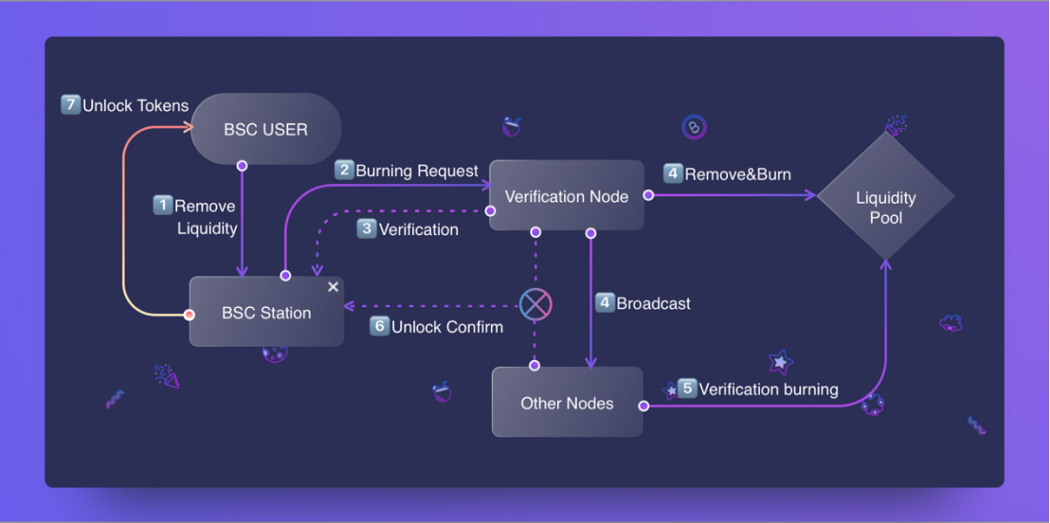 當用戶想要提取流動性并回到 BSC 時,經過節點聯盟的一系列驗證之后,BSC Station 將解鎖 LP 代幣并發送至用戶錢包地址。