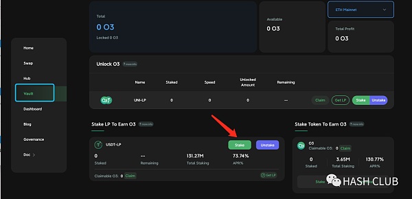 授權完成后回到O3頁面,點擊Valut頁面后,點擊stake