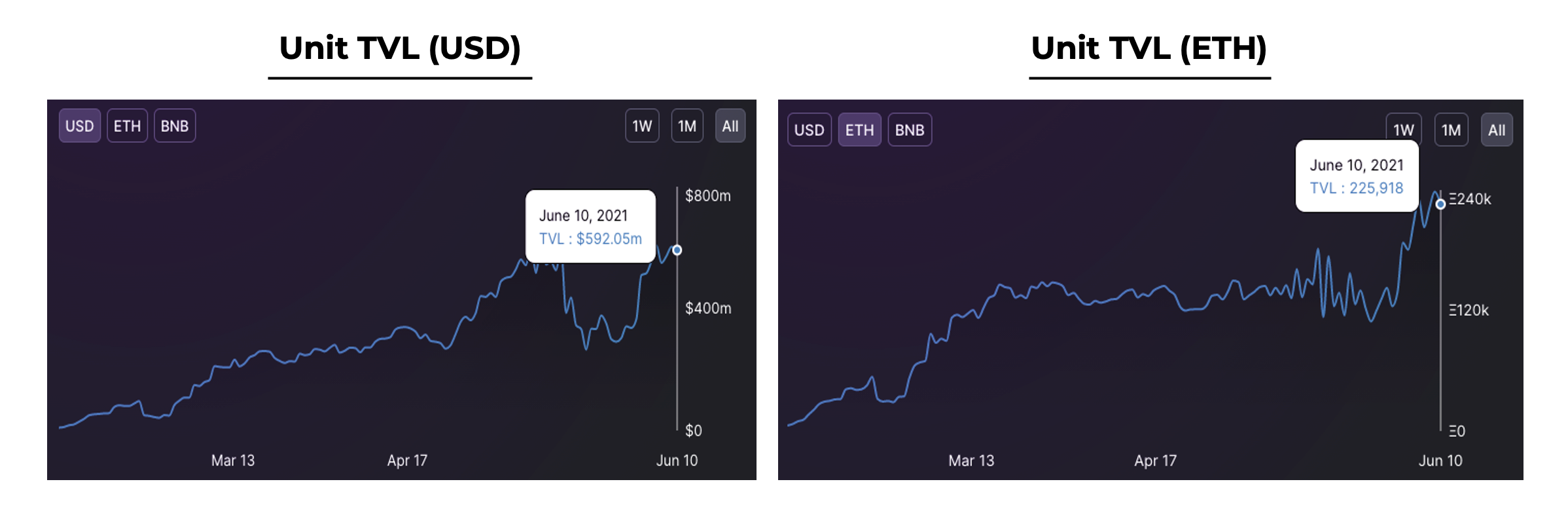 盡管自成立以來幾乎沒有營銷,但Unit的TVL最近已膨脹到近6億美元。雖然其大多數抵押品類型與ETH的價值嚴重相關,但Unit相對于ETH的TVL不斷地觸及了歷史新高。