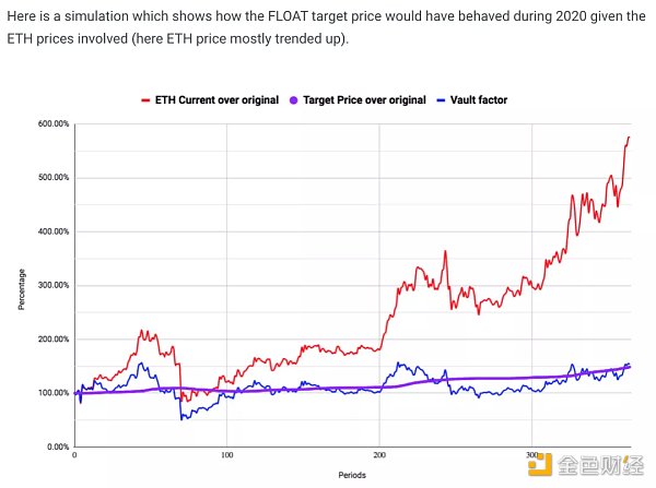 在理想狀態(即目標價格=當前價格)下,金庫中的ETH和流通中的FLOAT市值是相同的,所以,FLOAT總市值的錨,就是金庫中鎖定的ETH市值